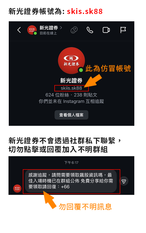 【重要提醒】近期不明人士仿冒本公司社群帳號,以私訊領取飆股資訊為由誘使投資人加入群組,敬請提高警覺切勿受騙。近日有不明人士仿冒本公司社群帳號,並盜用新光證券商標建立「新光證券」帳號,企圖以私訊領取飆股資訊為由誘騙投資人加入群組,該帳號任何活動均與本公司無關,請投資人提高警覺,切勿點擊任何連結或回覆提供個人資訊。新光證券提醒您:本公司及其業務人員均不會透過簡訊、電話、電子郵件或社群媒體(如Facebook、Instagram、Threads)等方式,私下聯繫邀請投資人點擊任何連結,或要求提供個人資訊。如您收到任何不明訊息或可疑帳號聯繫,或對任何涉及本公司名稱的活動有疑問,請立即聯繫新光證券專線0800-85-99-88 查詢,或撥打 165 反詐騙專線以保障您的權益。