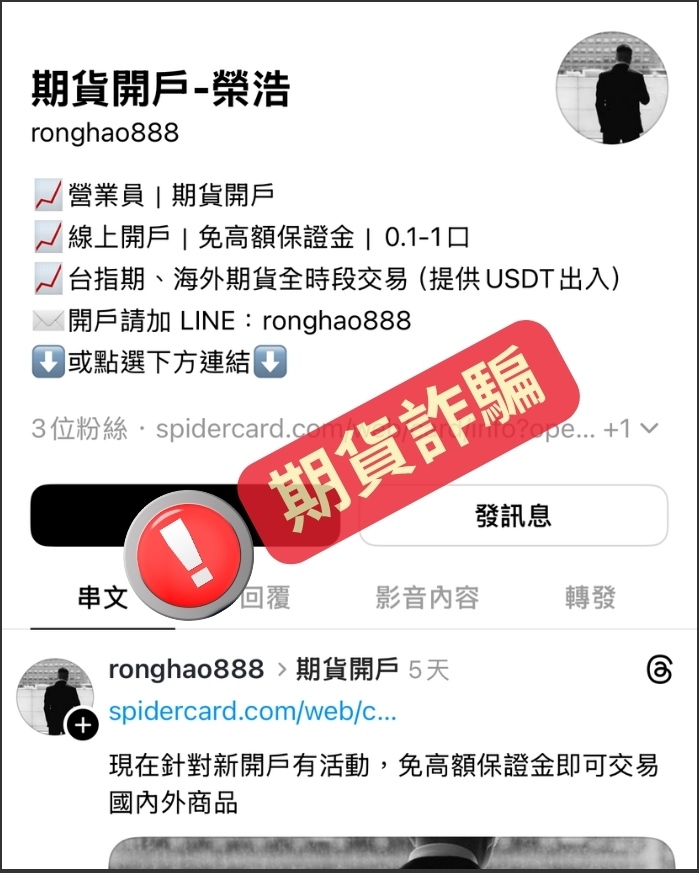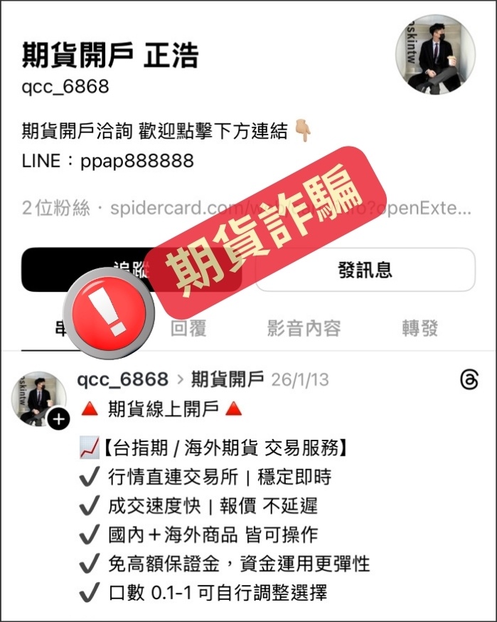 防詐提醒:留意網路上疑似地下期貨開戶招攬訊息近期本公司發現,網路社群平台上有帳號刊登涉及期貨開戶、低保證金交易等招攬訊息,並引導民眾透過通訊軟體或外部連結聯繫辦理相關作業。提醒投資人,辦理期貨或其他金融商品開戶,應循合法立案機構及正式管道辦理。對於社群平台、陌生帳號、不明連結,或標榜低門檻、快速開戶、特殊出入金方式等訊息,務必提高警覺,審慎查證,避免落入非法招攬或投資詐騙風險。本公司已就相關可疑資訊進行檢舉。提醒您,切勿任意提供個人資料、帳戶資訊或依指示匯款至不明帳戶,如遇可疑情形,請儘速撥打 165反詐騙諮詢專線,或洽本公司客服專線 0800-85-99-88 查證。